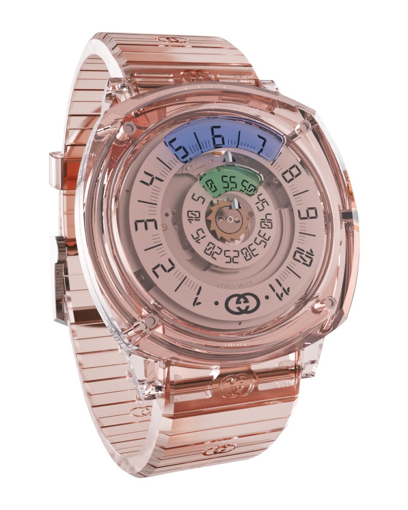 時分を表示する小窓を異なるカラーに仕上げるなど、モダンながらもユニークなデザインはまさに「グッチ」の本領。