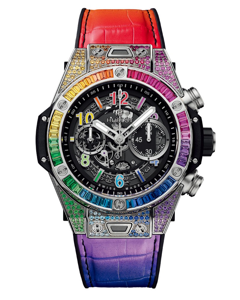 ▲ 「ビッグ・バン ウニコ チタニウム レインボー」自動巻き、Tiケース(45mm)、アリゲーター+ラバーストラップ。10気圧防水。821万7000円/ウブロ