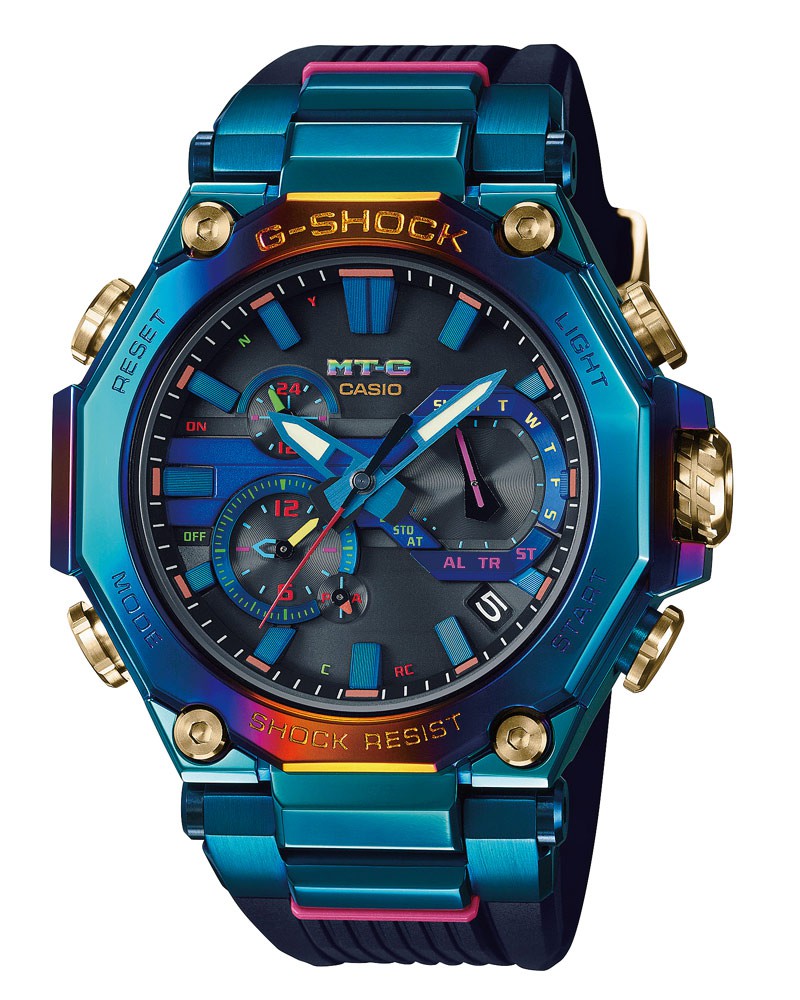 ▲ 「MTG-B2000PH」電波式、レインボーIPケース(55.1×51mm)×ブレスレット。20気圧防水。14万3000円/カシオ(カシオお客様相談室)