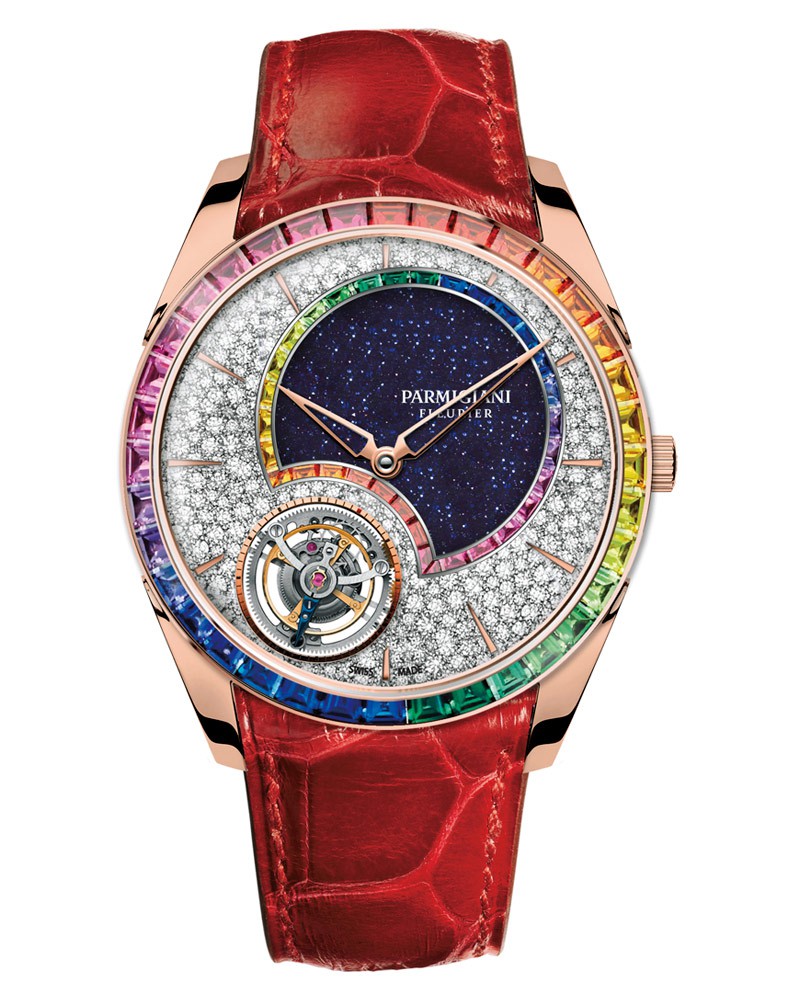 ▲ 「トンダ 1950 ダブルレインボー フライングトゥールビヨン」自動巻き、18KRGケース(40.2mm)、アリゲーターストラップ。2475万円/パルミジャーニ・フルリエ