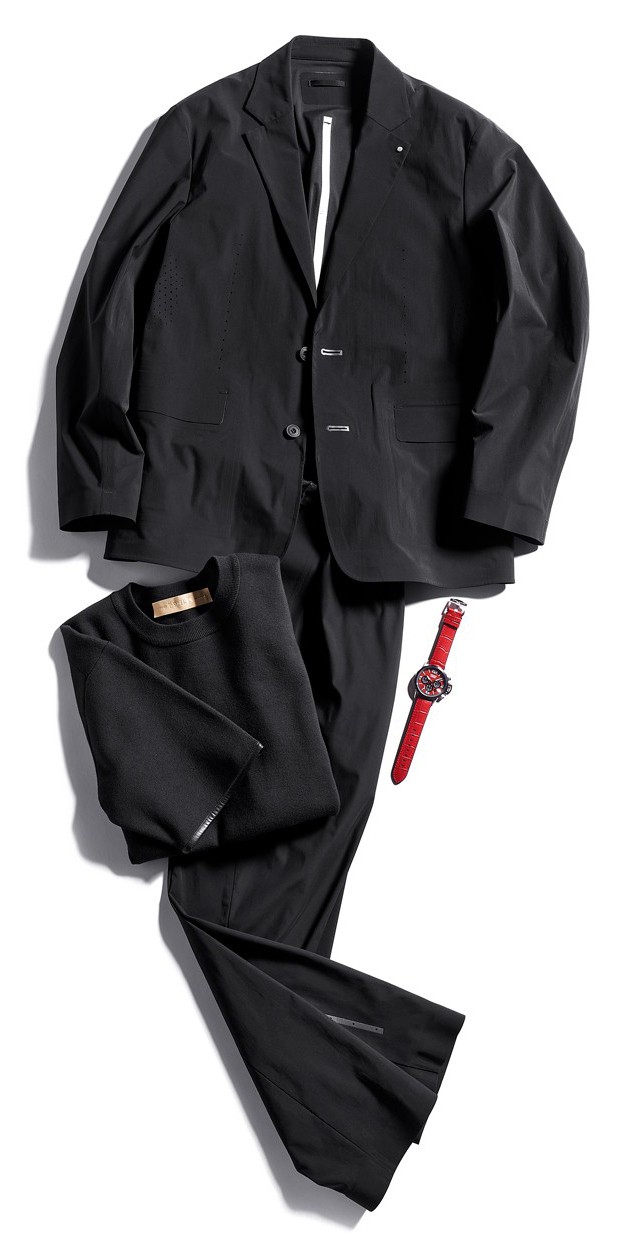 また、セットアップのシャカっとした質感に対し、肉厚なTシャツを選ぶことでメリハリが付き、オールブラックでも単調な印象になりません。オフスタイルとしても、カジュアルめなワークスタイルとしても取り入れたいスタイリングですね。