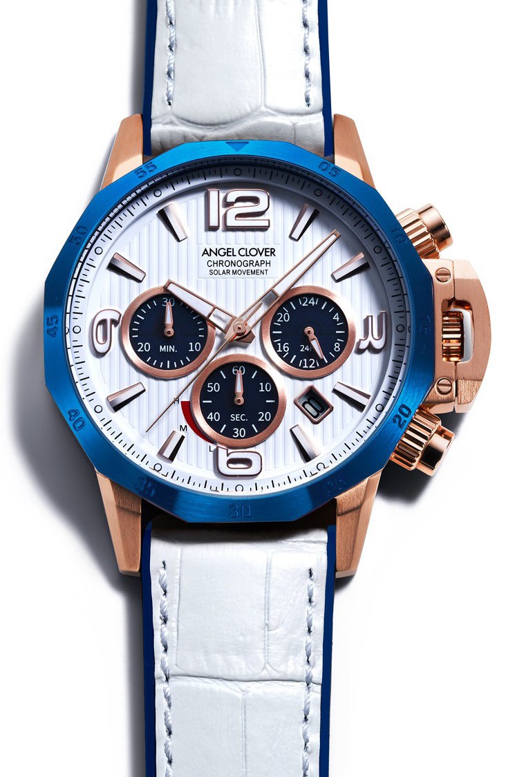 ▲ 「タイムクラフトソーラー」ソーラークオーツ、SSケース(45mm)、カーフレザー&ラバーストラップ(ホワイトとグリーンの2種付属)。10気圧防水。2万8600円/エンジェルクローバー(ウエニ貿易)