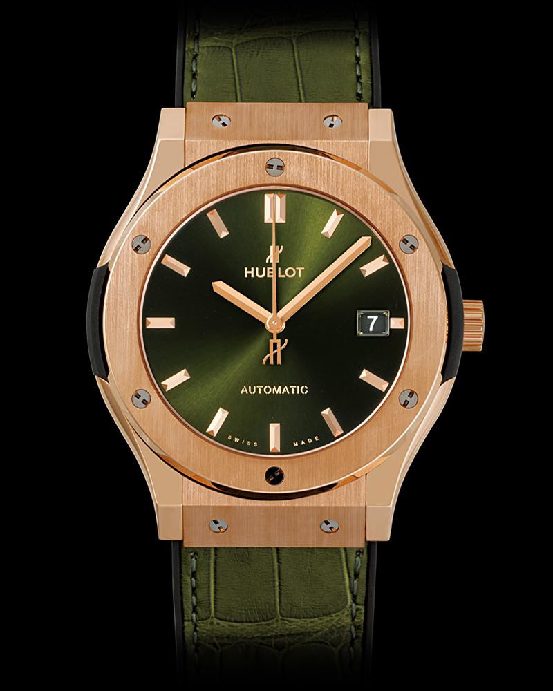 「クラシック・フュージョン キングゴールド グリーン」自動巻き、18Kキングゴールドケース(45㎜)、グリーンアリゲーター×ブラックラバーストラップ。5気圧防水。249万円/ウブロ