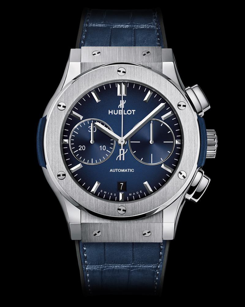 「クラシック・フュージョン クロノグラフ チタニウム ディープブルー」自動巻き、Tiケース(45㎜)、ブルーヴィンテージアリゲーター×ブラックラバーストラップ。5気圧防水。日本限定。116万円/ウブロ