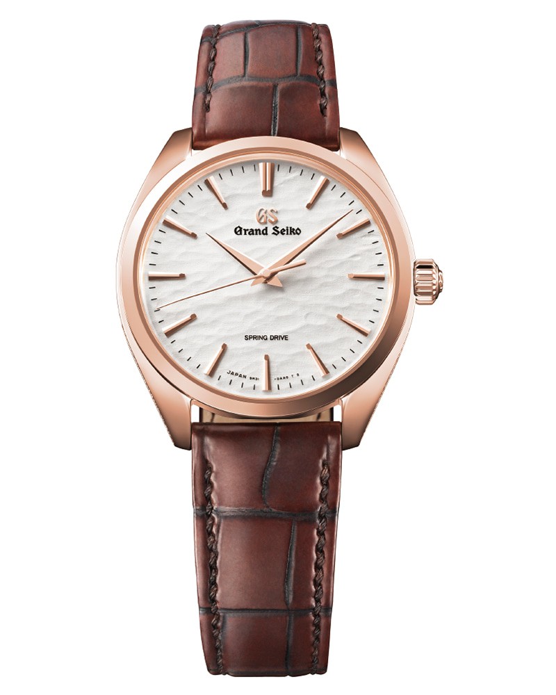 そんな名機を積んだ話題作のひとつが、エレガンスコレクションの限定モデル。信州の穏やかな冬景色である“垂れ雪”を表現した文字盤に加え、18KPG製ケースサイドにダイヤをライン状にあしらっているところが大きなポイント。