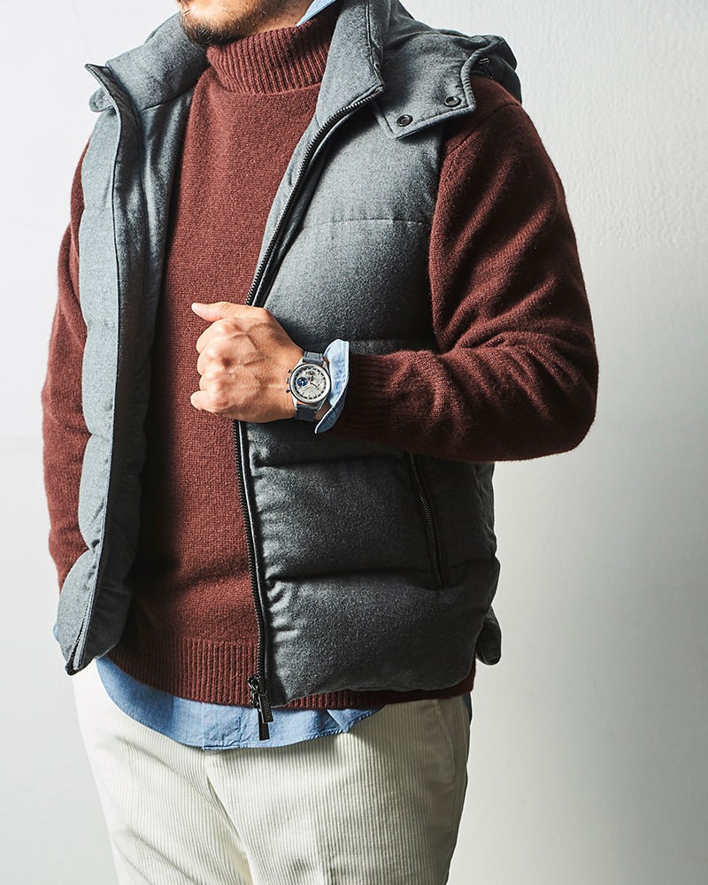▲ 時計96万8000円/ゼニス、ダウンベスト17万6000円/ムーレー(コロネット)、ニット2万2000円/シップス(シップス 銀座店)、シャツ2万7500円/ジャンネット(トヨダトレーディング プレスルーム)、パンツ4万5100円/PT TORINO(PT JAPAN)