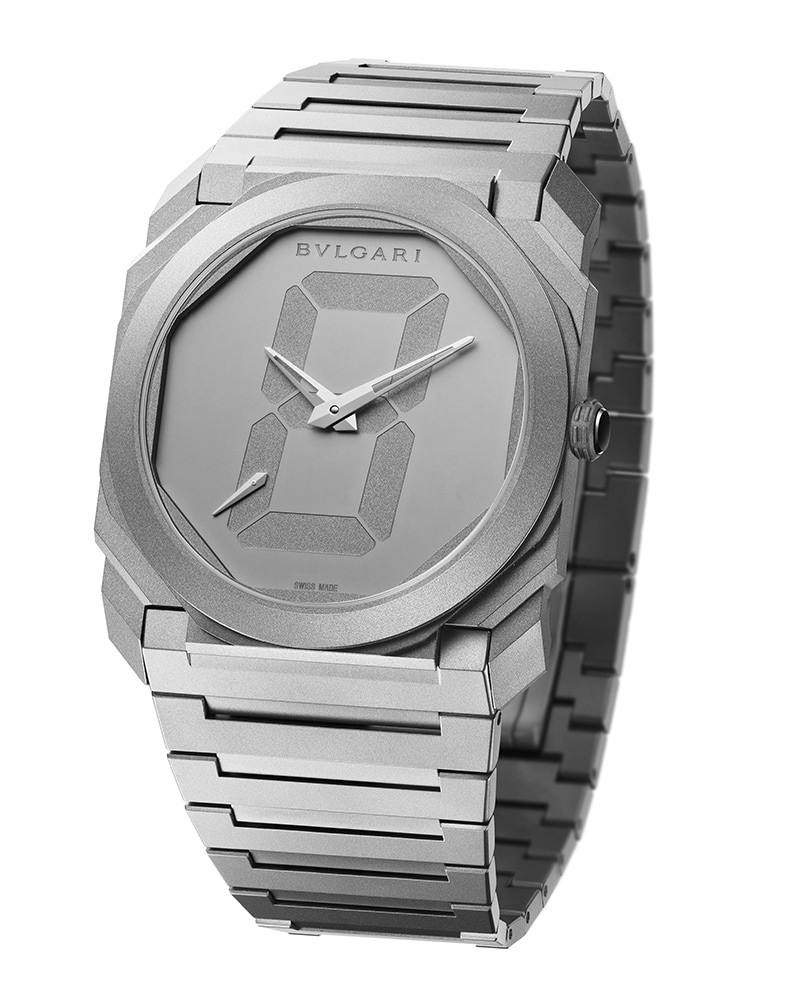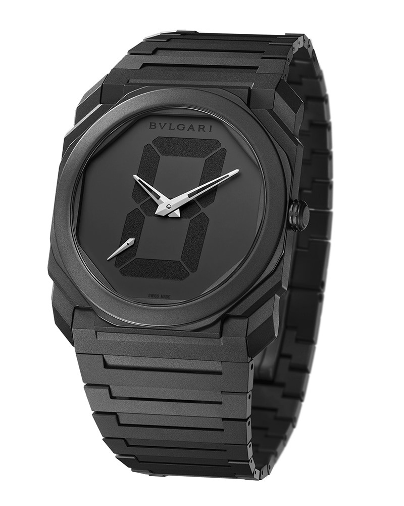 カミソリのように薄く、多面仕上げのケースにデジタル数字がマッチし、モダンかつミステリアスな印象に。チタン製とブラックセラミックの2種を展開。